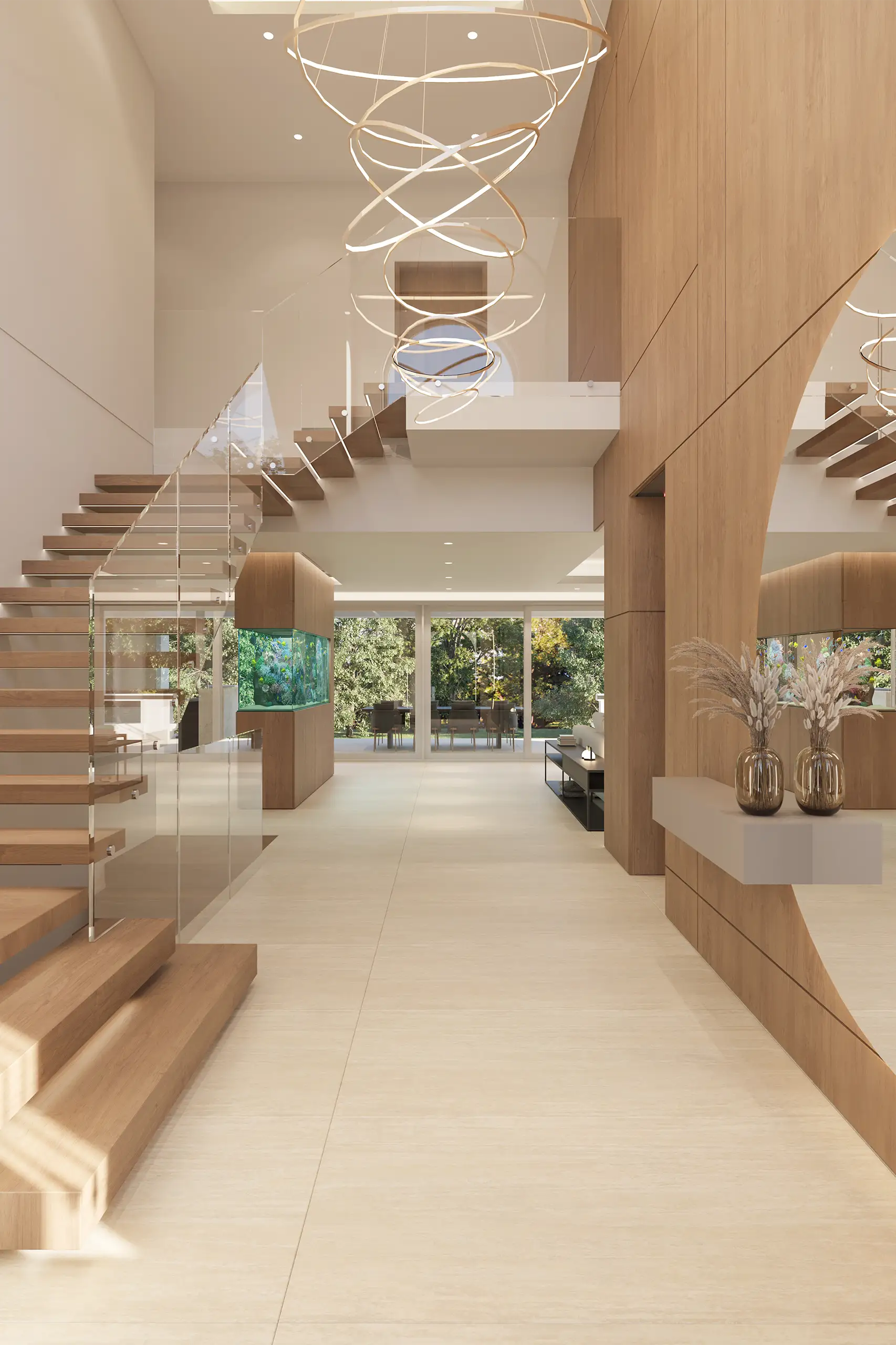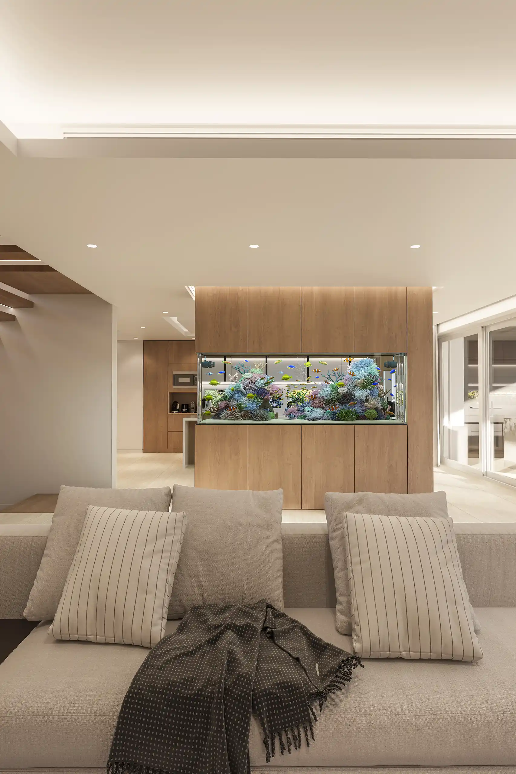 The double‑height entrance grants the residence hierarchy and presence, highlighting the quality of its materials and the attention to detail. The house is governed by the presence of water as a central element of its design. On the ground floor, where the social areas are located, an impressive saltwater aquarium rises as the focal point of the living room, adding dynamism and exclusivity. Outside, the heated pool integrates with the house via a staircase that leads to the barbecue area, establishing a seamless continuity between interior and exterior.