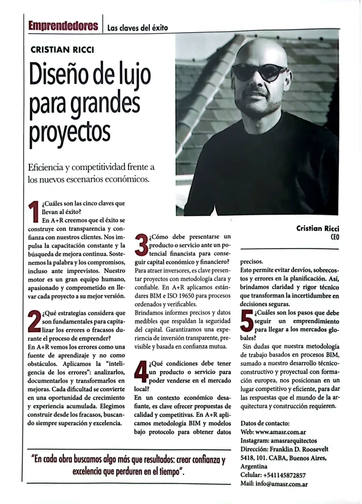 Revista Fortuna REVISTA: FORTUNA PUBLICACIÓN: 2025 La revista Fortuna presentó a A+R Arquitectos en una nota sobre diseño de lujo aplicado a grandes proyectos, resaltando su precisión técnica, su estética sofisticada y el valor que le otorgan a la confianza y la transparencia en cada obra. LEÉ LA NOTA ONLINE
